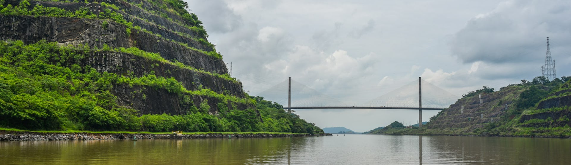 Den 77 kilometer långa Panamakanalen skär genom Panamas landskap och förbinder Atlanten med Stilla havet. Kanalen, som tog 11 år att bygga, anses vara en av världens viktigaste vattenvägar.