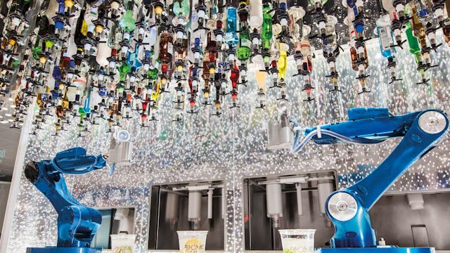 Med laserprecision arbetar robotarmarna på bartendrarna på Bionic Bar®, och i perfekt synkronisering blandas dina drinkar som du beställt från den digitala menyn. De blandar, muddlar och rör – det är bara att imponeras.