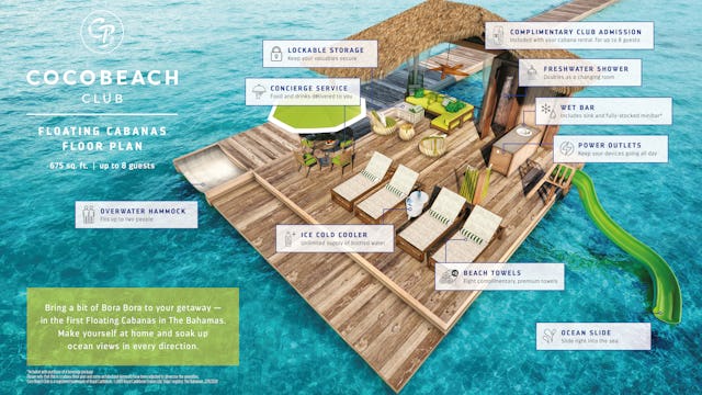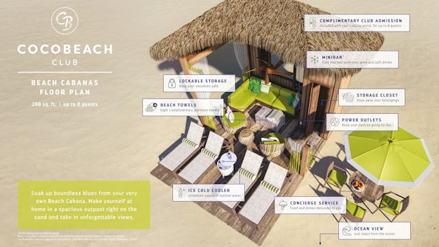 Samtliga cabanas inkluderar en soffa, matplats, fyra solstolar, låsbar förvaring, laddningsuttag, premiumhanddukar och obegränsat med vatten på flaska. Dessutom finns en minibar fylld med vin, öl och läsk. Här finns också en meny till Coco Beach Clubs® exklusiva restaurang och gästerna kan låna gratis snorkelutrustning. Utöver bekvämligheterna på Beach Cabanas har Floating Cabanas dessutom en hängmatta för två personer, sötvattensdusch och en rutschkana direkt ner i det kristallklara vattnet.