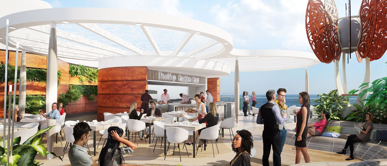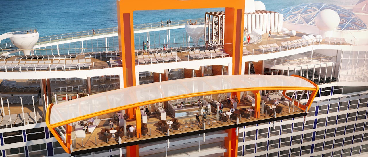 Restaurang på kvällen, del av poolområdet på dagen och brygga vid landstigning. Magic Carpet är en rörlig glasveranda utanför fartygskroppen.