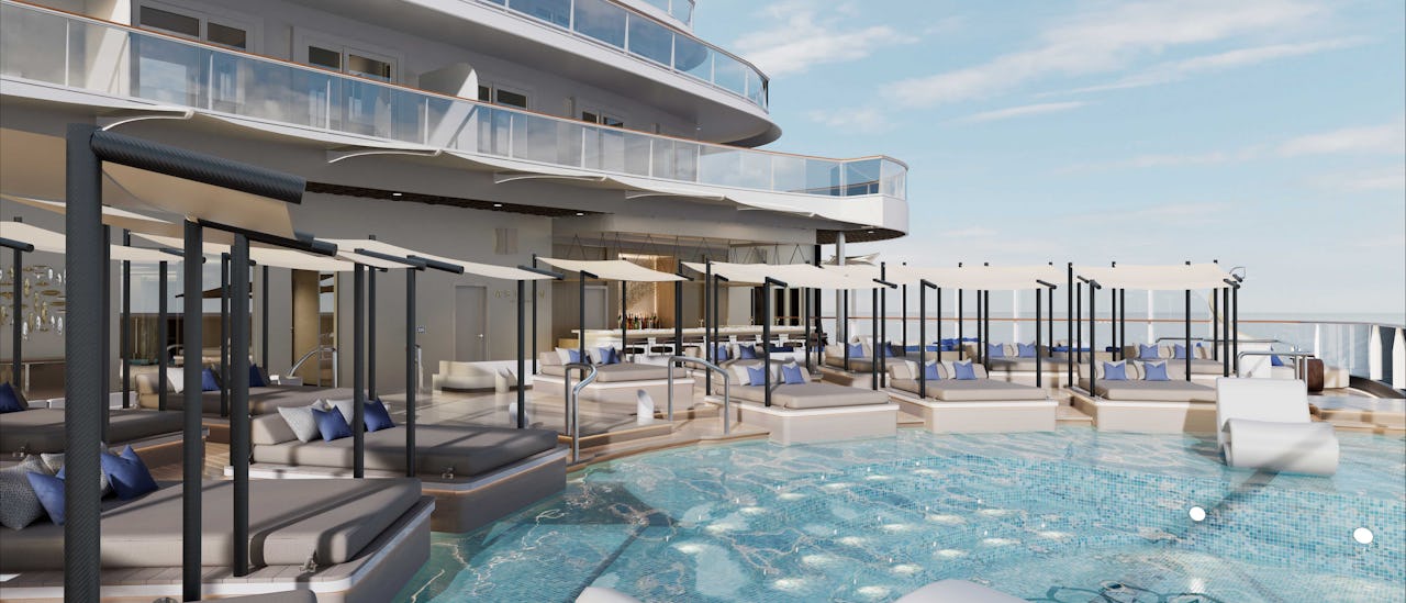 Generösa utomhusdäck stoltserar med mer än 2 500 kvm, en fantastisk utsikt över havet och 64 privata solsängar över 3 utomhuspooler.