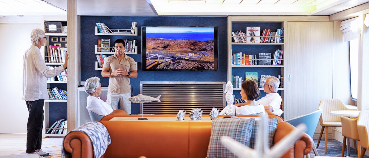 Expeditionsteamet ombord erbjuder spännande föreläsningar, presentationer och aktiviteter. Lär dig mer om Galápagosöarna i Science Center eller Vetenskapshörnan där det finns ett glasskåp, mikroskop och en samling med kopior av ben.
