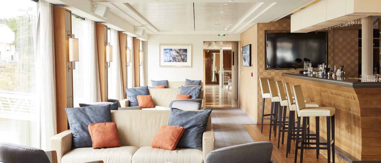 Enjoy the Lounge & Bar with panoramic views, unwind in the onboard Library and discover unique finds in the shop!
