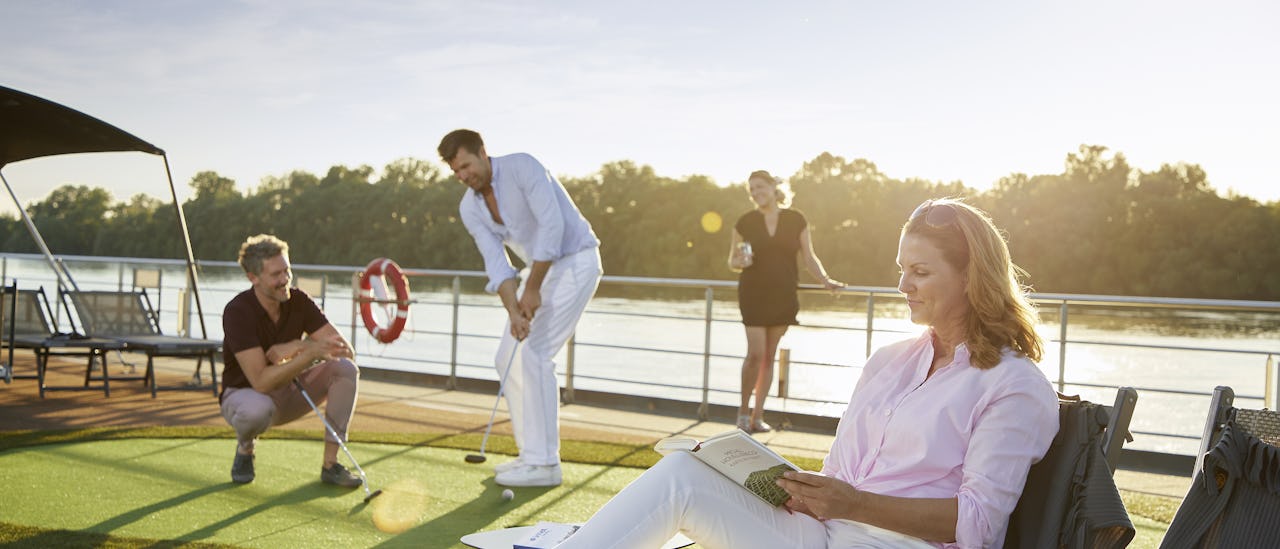 Njut av det vackra förbipasserande landskapet medan du spelar golf på soldäck eller kopplar av i bubbelpoolen, när du är i land kan du utforska omgivningarna med en rundtur på en av fartygets hyrcyklar!