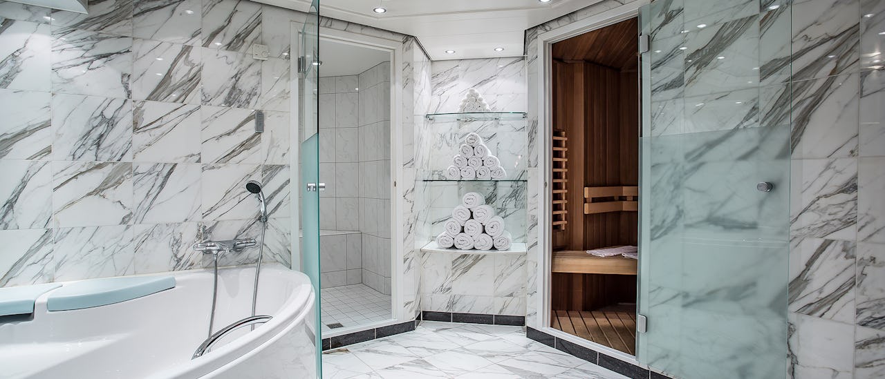Koppla av på det stora soldäcket med gott om solstolar där du kan njuta av utsikten över de vackra landskapen. Du kan också ladda batterierna i wellnessavdelningen med bastu, ångbad och bubbelpool efter en dag till havs.